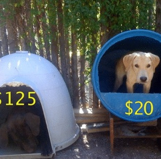 Cut the top off of the barrel (be sure to smooth the edges) and lay the barrel on its side. This makes the perfect kennel home! Our dogs love their barrel homes. The plastic insulates them from the cold in the winter and the heat in the summer. Its waterproof to protect from any misty or rainy days. It is also easy to clean! You can spray them out and deep clean them. We like to bleach ours a few times a year (of course make sure to rinse the houses and air them out before letting your four legged friend move back in)!